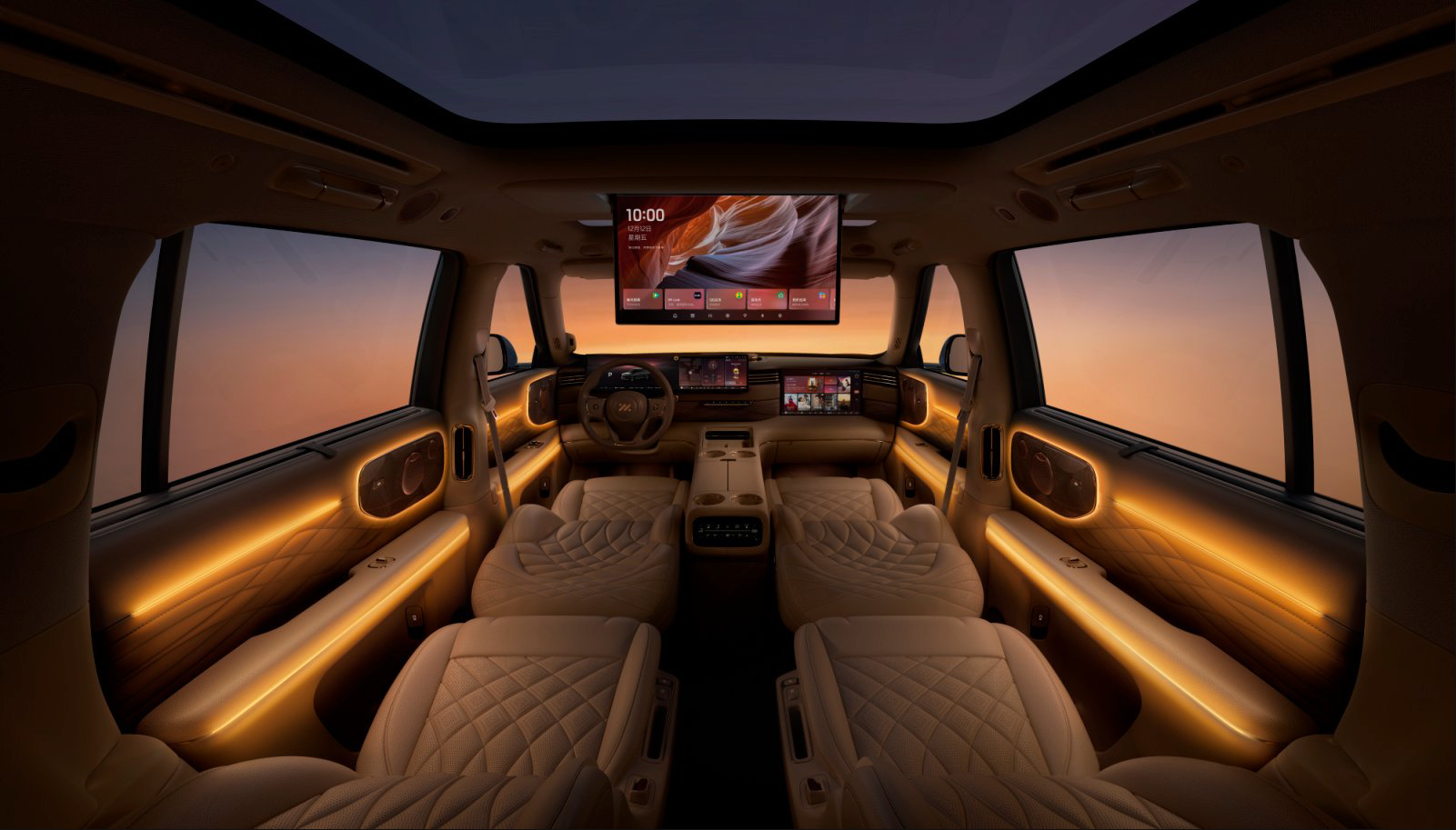 内饰空间以头等舱为灵感,大量皮革材质与高级座椅营造豪华氛围。非对称布局中,27.1英寸5K双联屏负责车辆信息与多媒体显示,副驾驶嵌入15.6英寸3K娱乐屏,提供丰富功能。二排配备两张零重力独立座椅,搭载21.5英寸4K娱乐吸顶屏,Nappa真皮材质与4D机械按摩功能凸显配置诚意。B&O音响系统总功率达3472W,25个扬声器带来沉浸式视听体验。