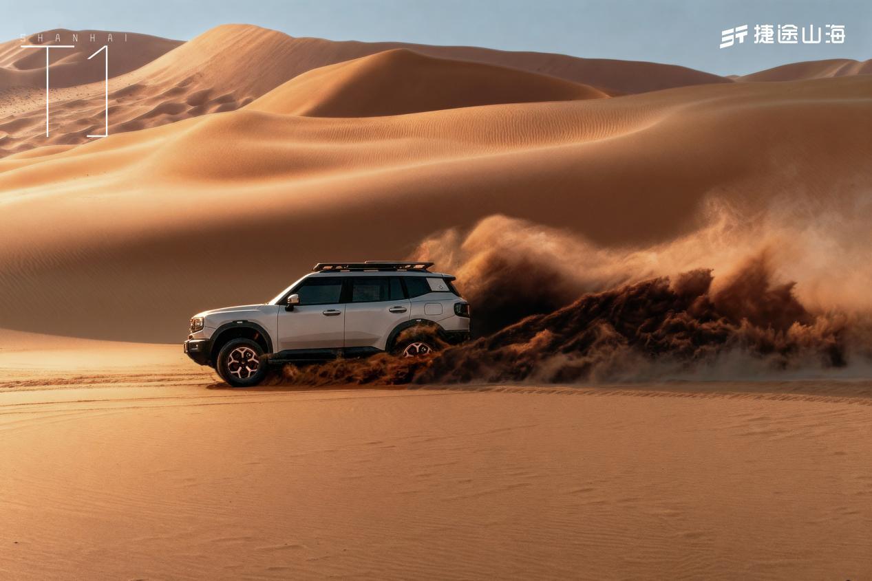 安全与通过性方面,山海T1采用笼式车身结构,高强度钢占比超80%,配合装甲级底盘防护,为车辆提供全方位保护。28°接近角、29°离去角及600mm涉水深度,使其通过性媲美专业越野车型,轻松应对戈壁碎石、泥泞道路等复杂地形。