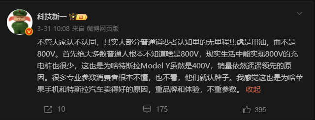 科技博主@科技新一在社交平台分享观点称,多数消费者对"无里程焦虑"的理解仍停留在燃油车层面,而非电动汽车行业热议的800V高压平台技术。他强调,普通用户既不了解800V的具体含义,也难以接触到支持该技术的充电设施,这解释了为何采用400V架构的特斯拉Model Y仍能保持市场领先地位。