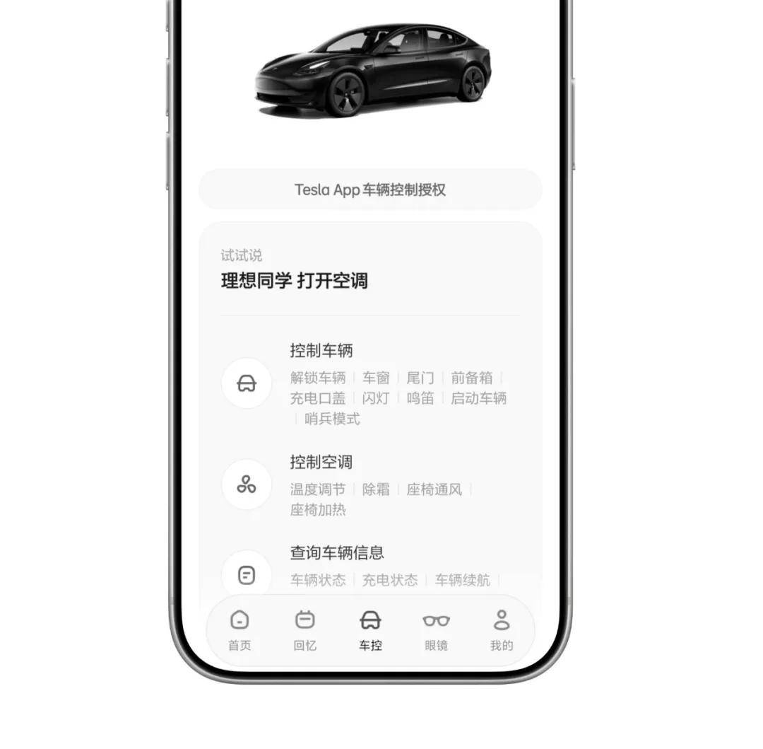 在交互设计方面,理想同学采用全语音控制模式替代传统按钮操作。用户既可直接通过语音指令"打开特斯拉空调"完成操作,也可借助理想Livis AI眼镜实现视觉交互控制。这种设计既保持了界面简洁性,又通过多模态交互提升了操作便捷度。当用户绑定多台车辆时,可通过车控界面顶部的车辆切换栏快速管理不同座驾。
